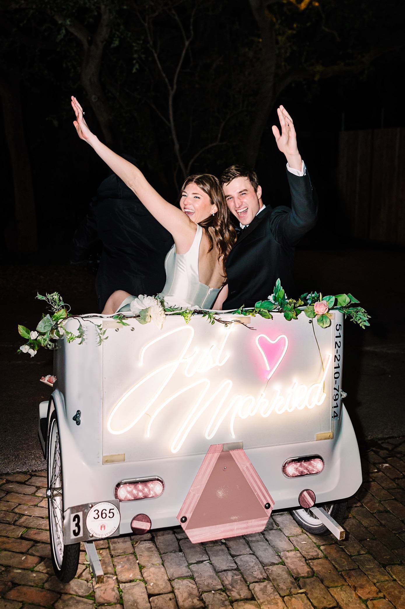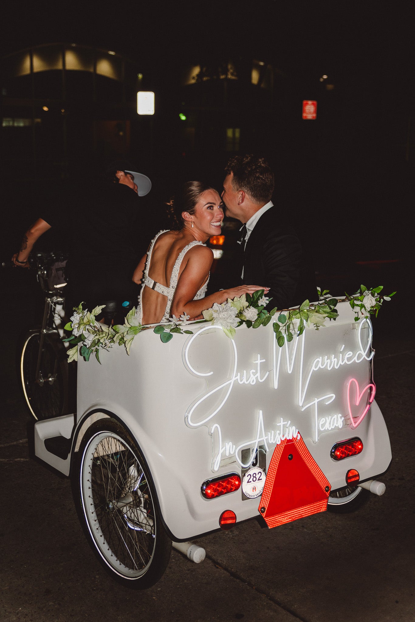 Please note: The listed price includes a wedding pedicab without decorations and includes the equivalent of one extra hour for transportation. Upgrading to one of our decoration packages or for locations further from Downtown Austin will incur additional fees.