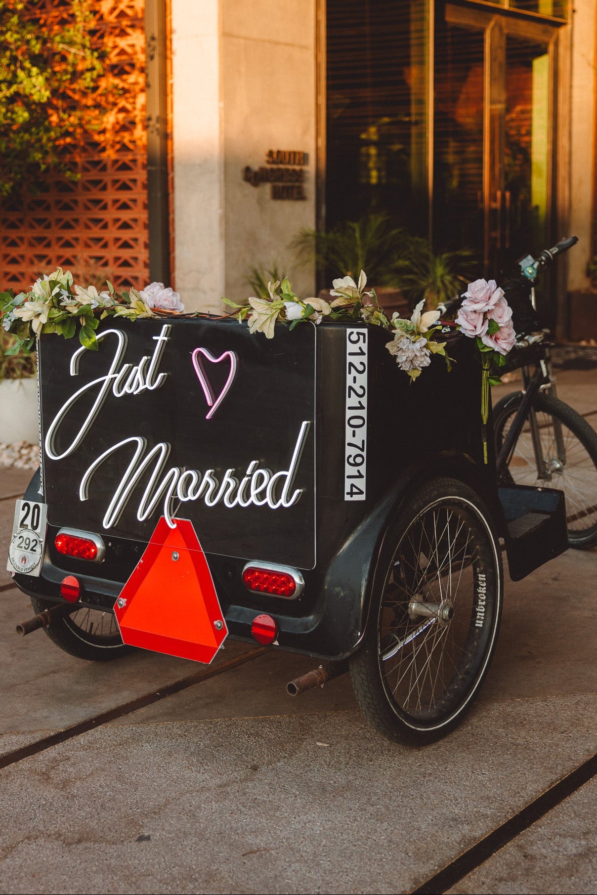 The Premium Wedding Pedicab features a sleek, all-black design for a modern and elevated look. Enhance the experience with upgraded décor, including a vibrant LED neon “Just Married” sign and premium faux floral arrangements, creating a stylish and memorable wedding send-off.