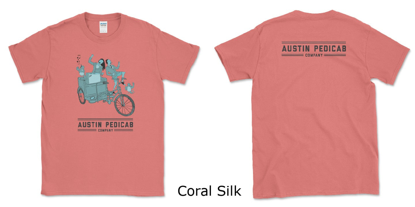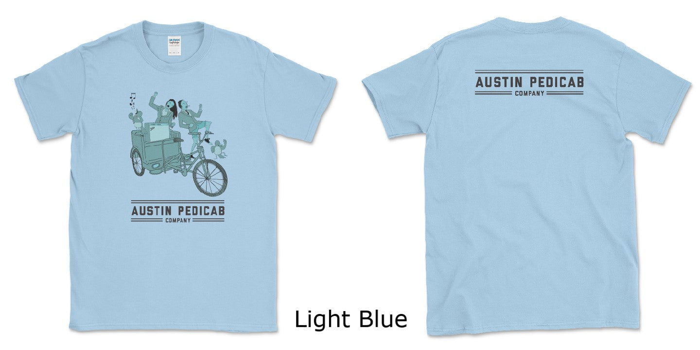 This t-shirt comes in 4 colors: a red, yellow, green, and blue. It's screen printed on Gildan Softstyle. Initially, this was a design that local artist, Fabian Puente, did for the Instagram account. We had him make some adjustments and got it printed on a shirt. This is a t-shirt designed and printed in Austin for a Pedicab Company based out of Austin.