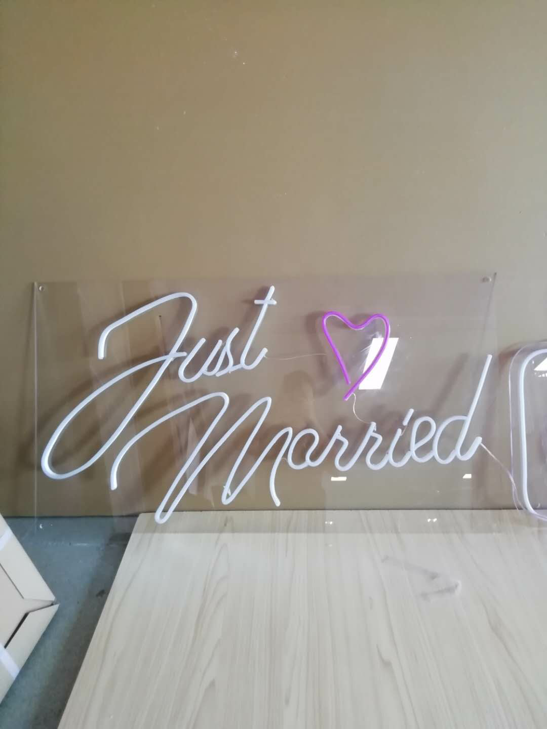 This is a wall-mountable vintage-style neon LED "Just Married" sign. Regular neon signs are prone to breaking and require more power. Neon-style LED signs look identical, draw less power, and are more durable.